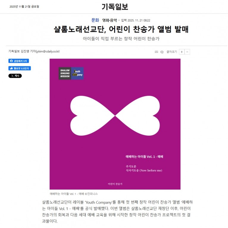 [기사] 샬롬노래선교단, 어린이 찬송가 앨범 발매(기독일보)