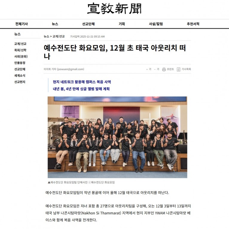 뮤직타임 [기사] 예수전도단 화요모임, 12월 초 태국 아웃리치 떠나(선교신문)