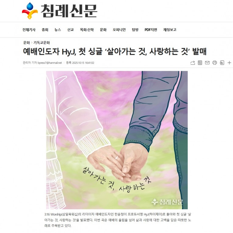 [기사] 예배인도자 Hy.J, 첫 싱글 ‘살아가는 것, 사랑하는 것’ 발매(침례신문사)