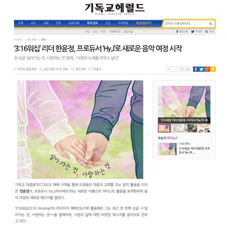 [기사] ‘3:16워십’ 리더 한윤정, 프로듀서 ‘Hy.J’로 새로운 음악 여정 시작(기독교헤럴드)