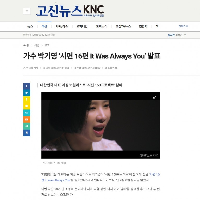 뮤직타임 [기사] 가수 박기영 ‘시편 16편 It Was Always You’ 발표(고신뉴스 KNC)