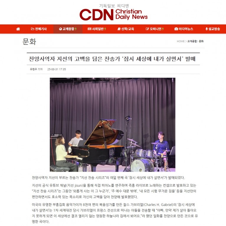 [기사] 찬양사역자 지선의 고백을 담은 찬송가 ‘잠시 세상에 내가 살면서’ 발매(기독일보 씨디엔)