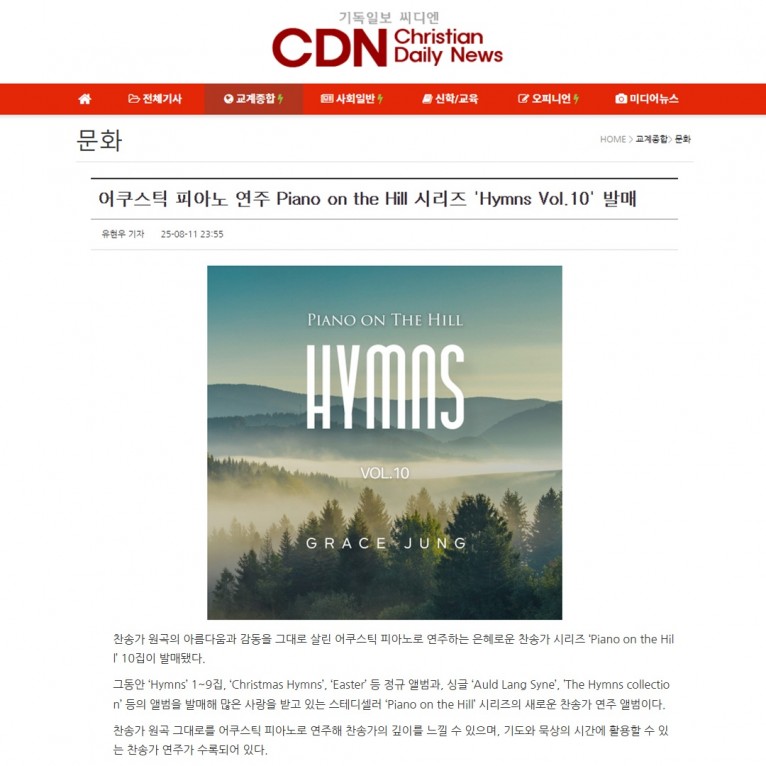 뮤직타임 [기사] 어쿠스틱 피아노 연주 Piano on the Hill 시리즈 'Hymns Vol.10' 발매(기독일보 씨디엔)