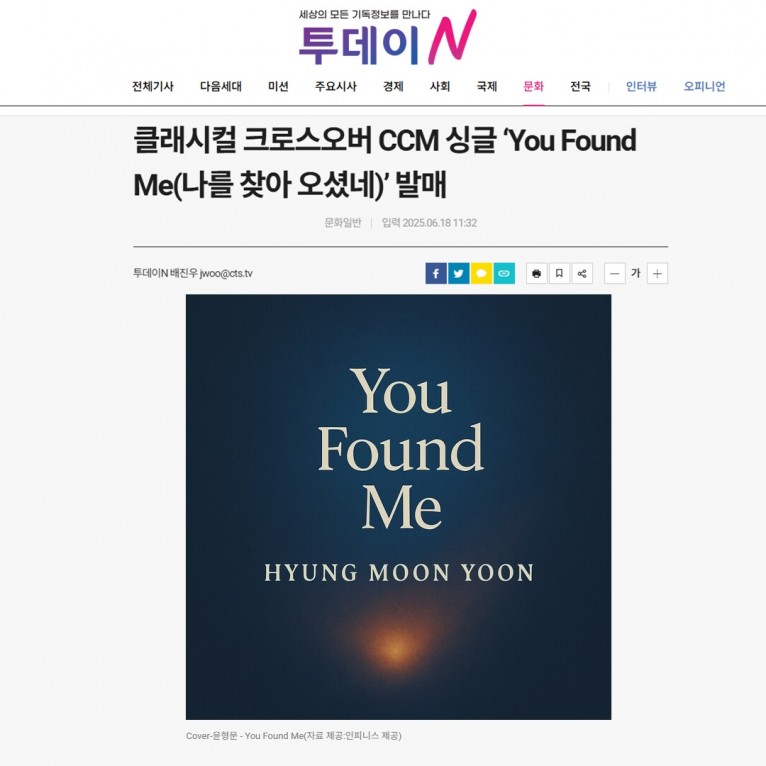 뮤직타임 [기사] 클래시컬 크로스오버 CCM 싱글 ‘You Found Me(나를 찾아 오셨네)’ 발매(CTS 투데이N)