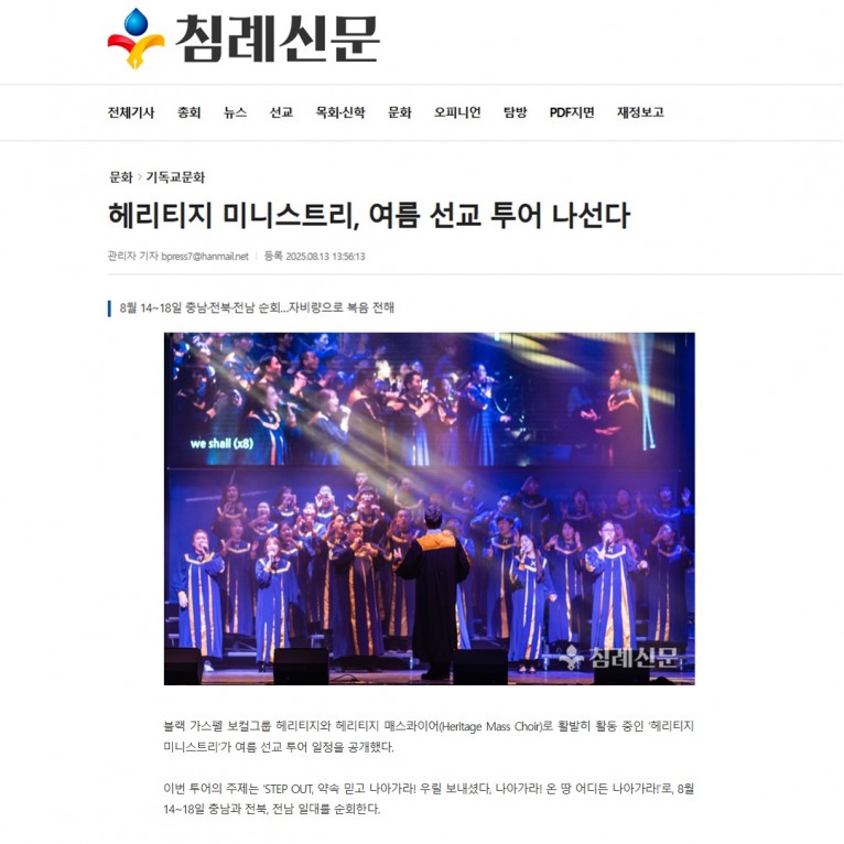 블랙 가스펠 보컬그룹 헤리티지와 헤리티지 매스콰이어(Heritage Mass Choir)로 활발히 활동 중인 ‘헤리티지 미니스트리’가 여름 선교 투어 일정을 공개했다.