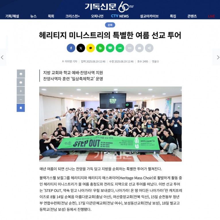 뮤직타임 [기사] 헤리티지 미니스트리의 특별한 여름 선교 투어(주간기독신문)