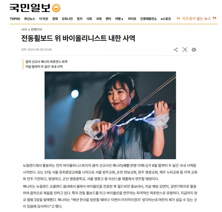 [기사] 전동휠보드 위 바이올리니스트 내한 사역(국민일보)