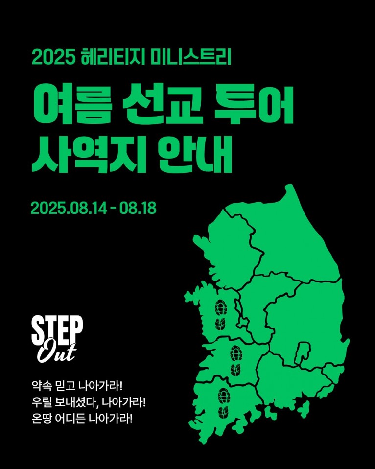 ‘STEP OUT, 약속 믿고 나아가라! 우릴 보내셨다, 나아가라! 온 땅 어디든 나아가라!’란 캐치프레이즈와 함께 8월 14일부터 18일 까지 여름 선교 투어를 갖는다.