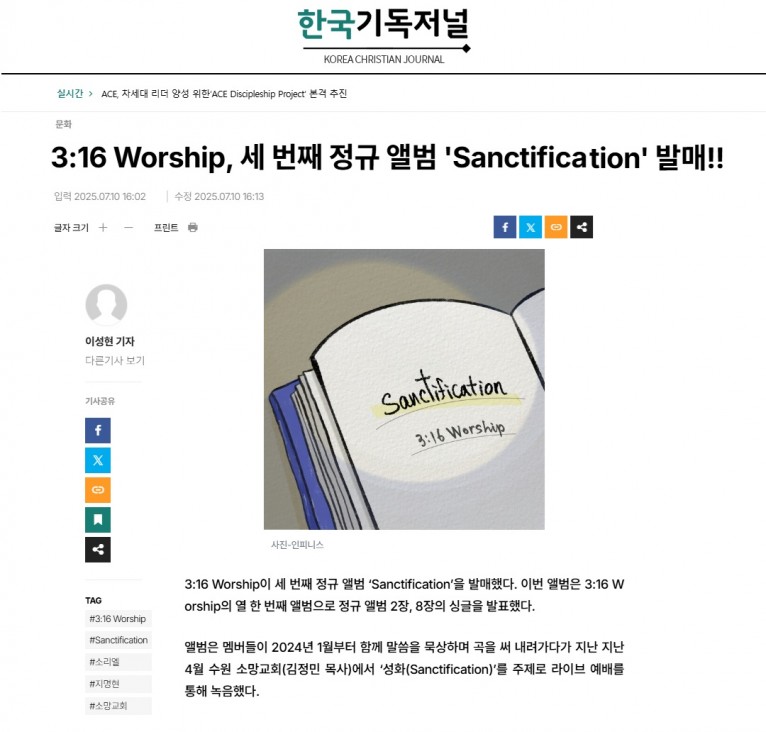 [기사] 3:16 Worship, 세 번째 정규 앨범 'Sanctification' 발매!!(한국기독저널)