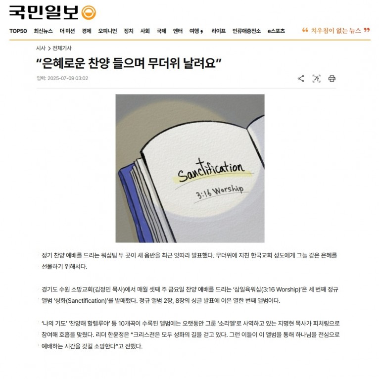 경기도 수원 소망교회(김정민 목사)에서 매월 셋째 주 금요일 찬양 예배를 드리는 ‘삼일육워십(3:16 Worship)’은 세 번째 정규 앨범 ‘성화(Sanctification)’를 발매했다. 정규 앨범 2장, 8장의 싱글 발표에 이은 열한 번째 앨범이다.
