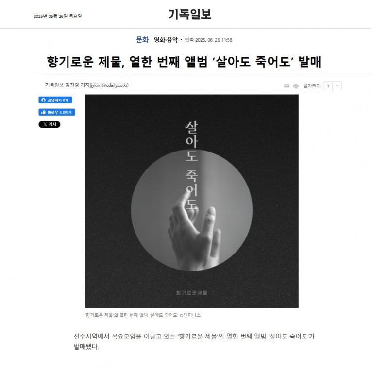 [기사] 향기로운 제물, 열한 번째 앨범 ‘살아도 죽어도’ 발매(기독일보)