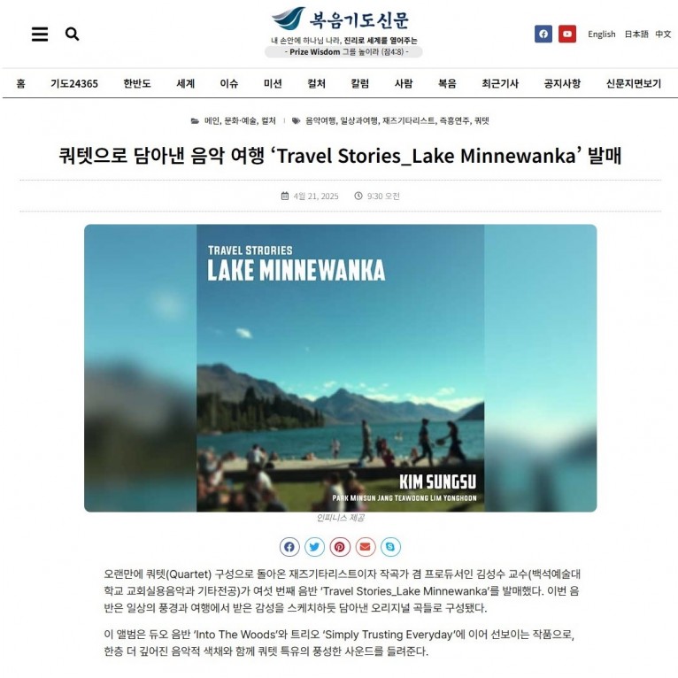 [기사] 쿼텟으로 담아낸 음악 여행 ‘Travel Stories_Lake Minnewanka’ 발매(복음기도신문)