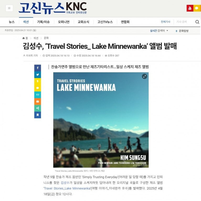 [기사] 김성수, ‘Travel Stories_ Lake Minnewanka’ 앨범 발매(고신뉴스 KNC)