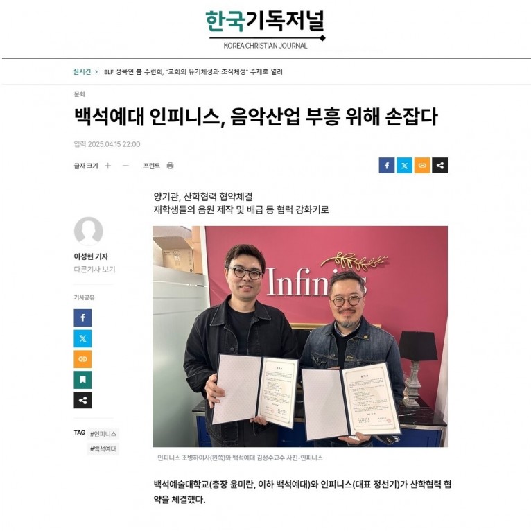 [기사] 백석예대 인피니스, 음악산업 부흥 위해 손잡(한국기독저널)