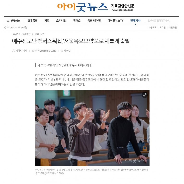 [기사] 예수전도단 캠퍼스워십, ‘서울목요모임’으로 새롭게 출발(기독교연합신문 아이굿뉴스)