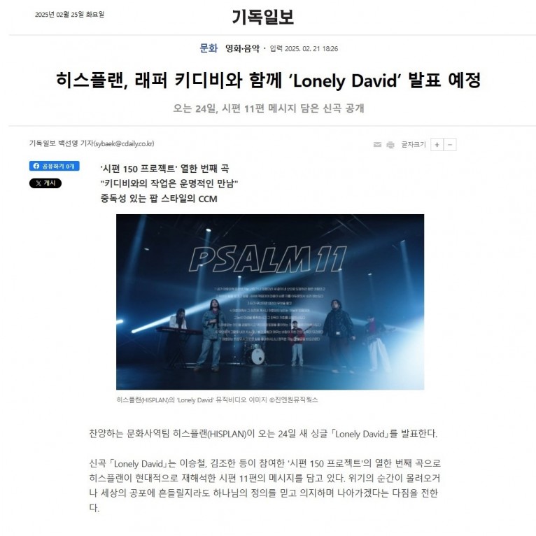 [기사] 히스플랜, 래퍼 키디비와 함께 ‘Lonely David’ 발표 예정(기독일보)