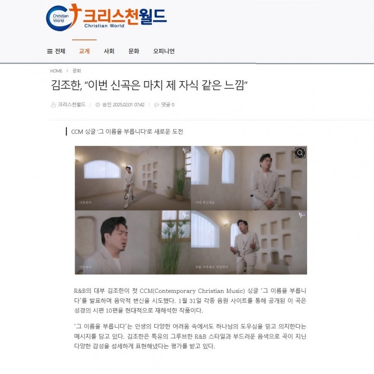 [기사] 김조한, “이번 신곡은 마치 제 자식 같은 느낌”(크리스천월드)