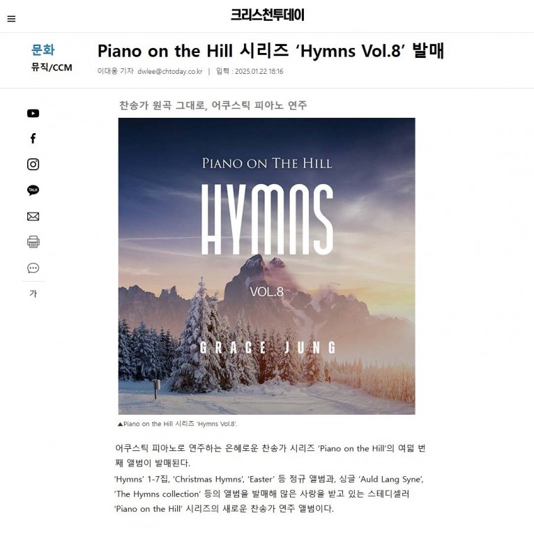 [기사] Piano on the Hill 시리즈 ‘Hymns Vol.8’ 발매(크리스천투데이)