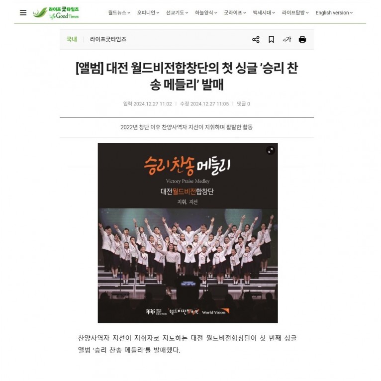 [기사] 대전 월드비전합창단의 첫 싱글 ’승리 찬송 메들리’ 발매(라이프굿타임즈)