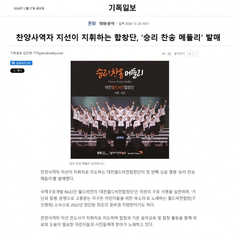 [기사] 찬양사역자 지선이 지휘하는 합창단, ’승리 찬송 메들리’ 발매(기독일보)
