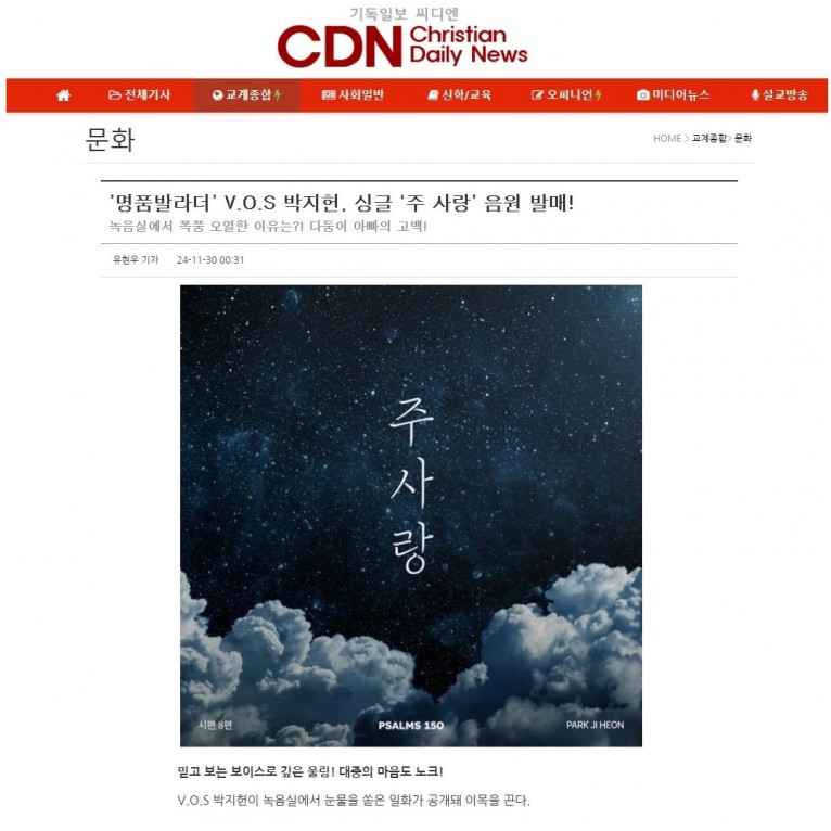 뮤직타임 [기사] ’명품발라더’ V.O.S 박지헌, 싱글 ‘주 사랑’ 음원 발매!(기독일보 씨디엔)