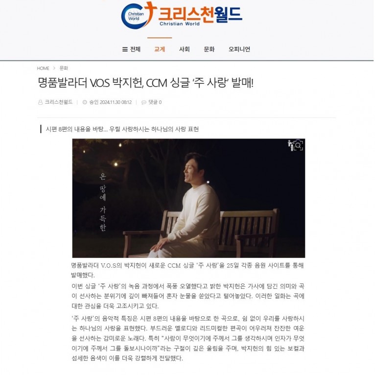 뮤직타임 [기사] 명품발라더 V.O.S 박지헌, CCM 싱글 ‘주 사랑’ 발매!(크리스천월드)