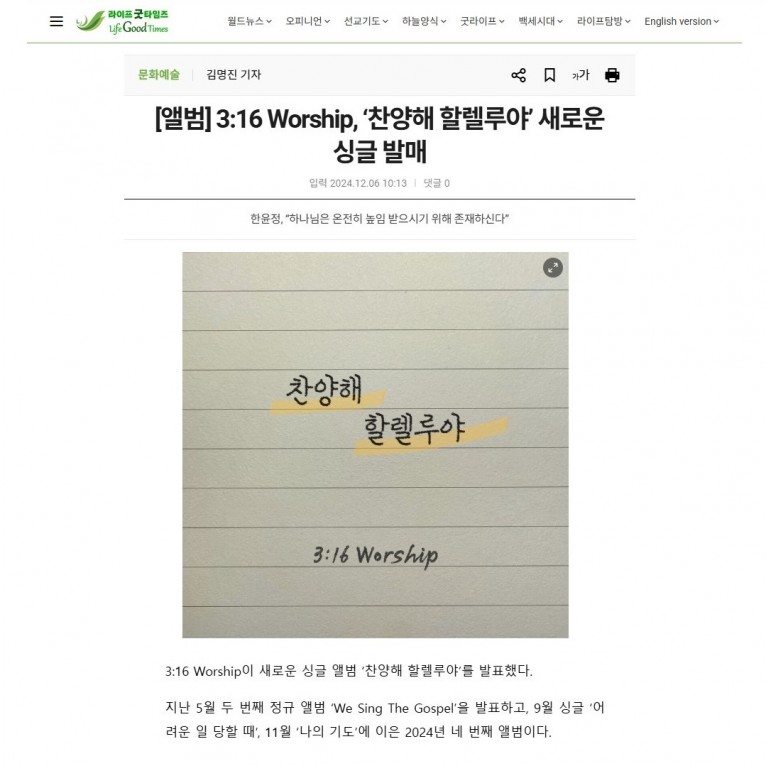 뮤직타임 [기사] 3:16 Worship, ‘찬양해 할렐루야’ 새로운 싱글 발매(라이프굿타임즈)