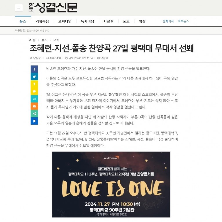 오는 11월 27일 오후 6시 반 평택대학교 90주년 기념관에서 열리는 월드비전, 평택대학교, 평택대학교회 주최 ‘LOVE IS ONE 찬양콘서트’에서는 조혜련, 지선, 폴송이 직접 출연하여 찬양 신곡을 무대에서 선보일 예정이다.