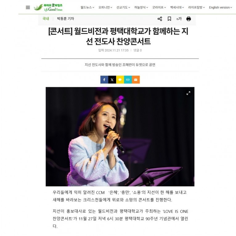 [기사] [콘서트] 월드비전과 평택대학교가 함께하는 지선 전도사 찬양콘서트(라이프굿타임즈)