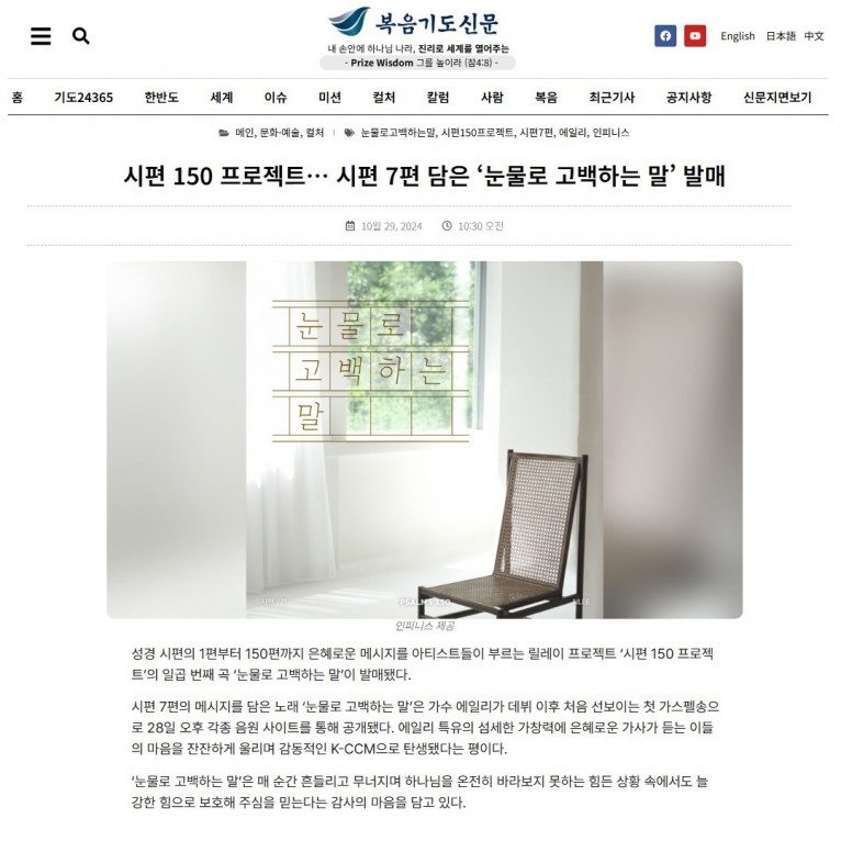 [기사] 시편 150 프로젝트… 시편 7편 담은 ‘눈물로 고백하는 말’ 발매(복음기도신문)