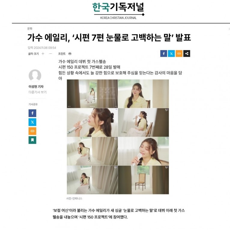 [기사] 가수 에일리, ‘시편 7편 눈물로 고백하는 말’ 발표(한국기독저널)