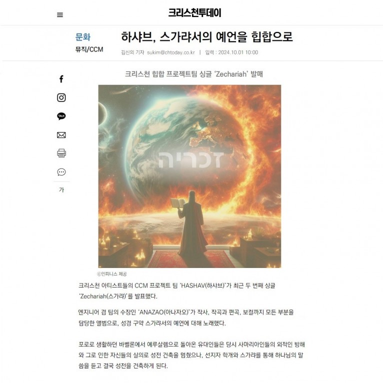크리스천 아티스트들의 CCM 프로젝트 팀 ‘HASHAV(하샤브)’가 최근 두 번째 싱글 ‘Zechariah(스가랴)’를 발표했다.