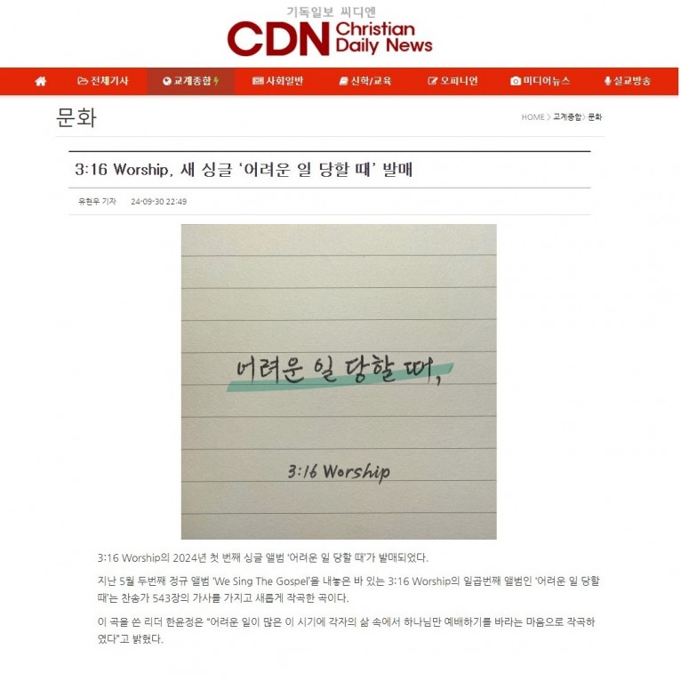 [기사] 3:16 Worship, 새 싱글 ‘어려운 일 당할 때’ 발매(기독일보 씨디엔)