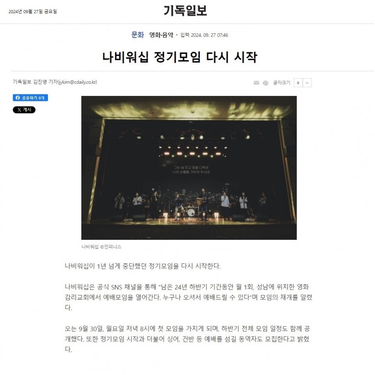 뮤직타임 [기사] 나비워십 정기모임 다시 시작(기독일보)