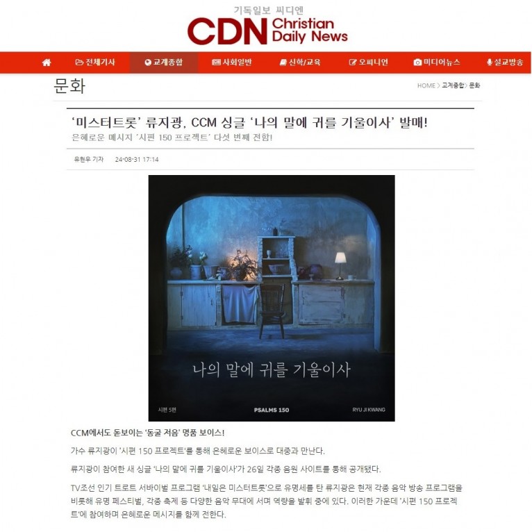 뮤직타임 [기사] ‘미스터트롯’ 류지광, CCM 싱글 ‘나의 말에 귀를 기울이사’ 발매!(기독일보 씨디엔)
