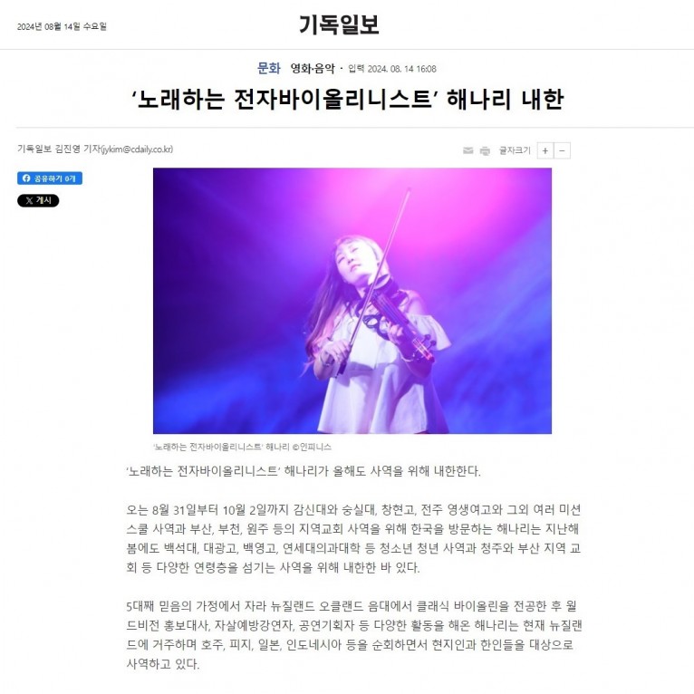 [기사] ‘노래하는 전자바이올리니스트’ 해나리 내한(기독일보)