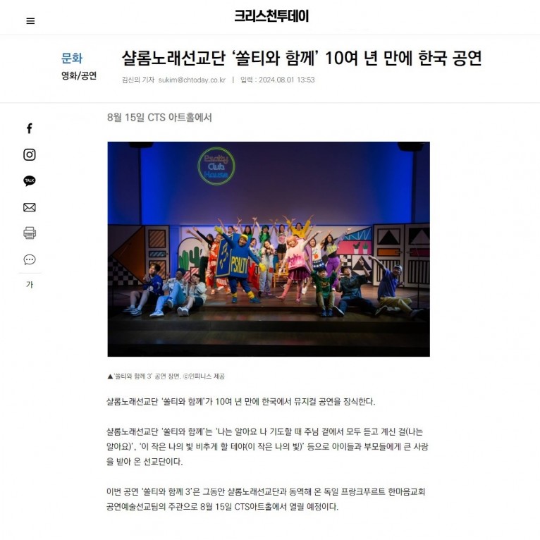 뮤직타임 [기사] 샬롬노래선교단 ‘쏠티와 함께’ 10여 년 만에 한국 공연(크리스천투데이)