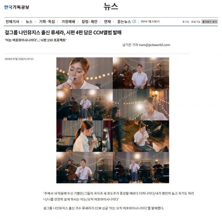 [기사] 걸그룹 나인뮤지스 출신 류세라, 시편 4편 담은 CCM앨범 발매(한국기독공보)