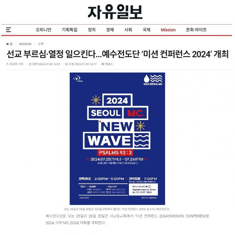 [기사] 선교 부르심·열정 일으킨다...예수전도단 ‘미션 컨퍼런스 2024’ 개최(자유일보)