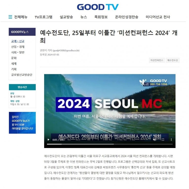 [보도] 예수전도단, 25일부터 이틀간 ‘미션컨퍼런스 2024’ 개최(기독교복음방송 GOODTV)