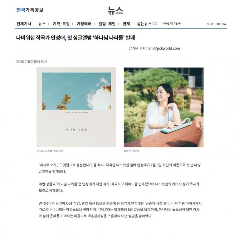 [기사] 나비워십 작곡가 안성애, 첫 싱글앨범 '하나님 나라를' 발매(한국기독공보)