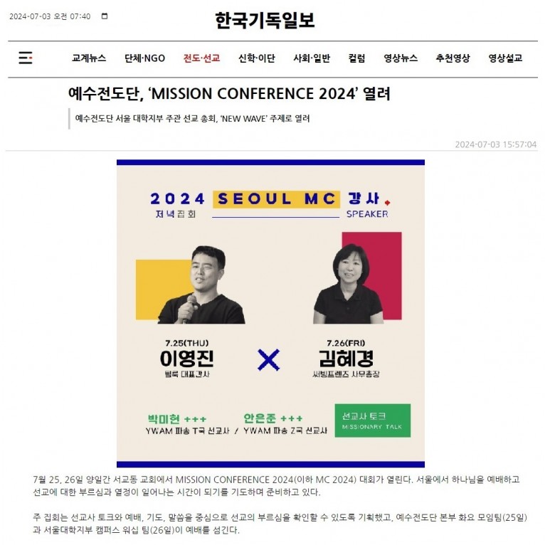 뮤직타임 [기사] 예수전도단, ‘MISSION CONFERENCE 2024’ 열려(한국기독일보)