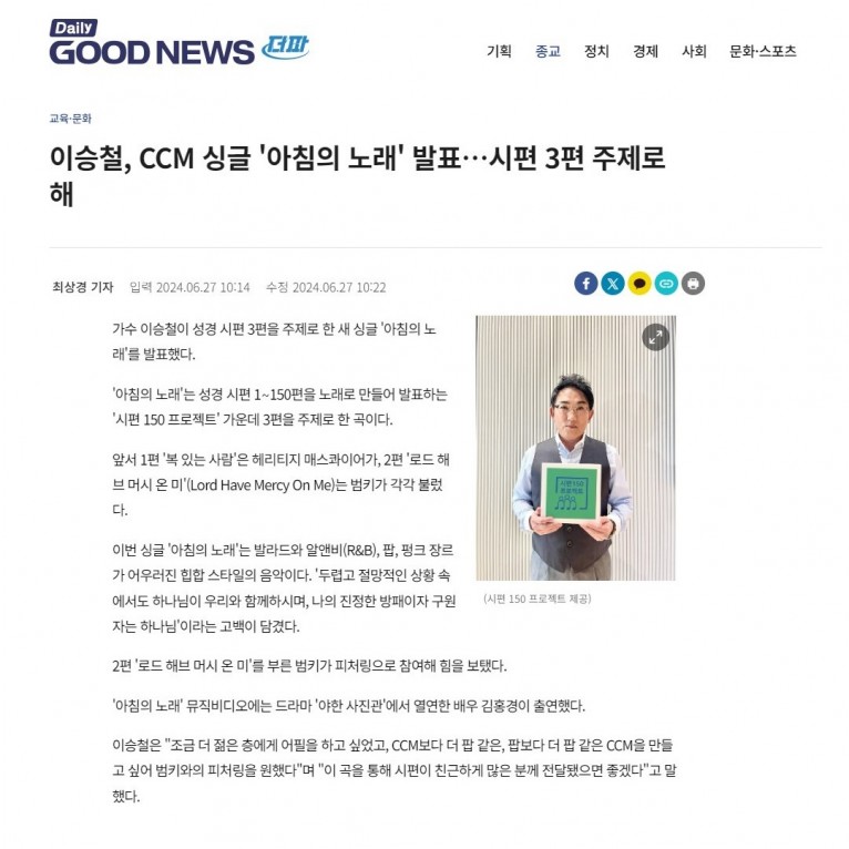 뮤직타임 [기사] 이승철, CCM 싱글 '아침의 노래' 발표…시편 3편 주제로 해(데일리굿뉴스)