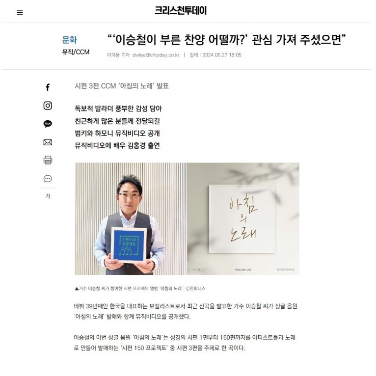[기사] “‘이승철이 부른 찬양 어떨까’ 관심 가져 주셨으면”(크리스천투데이)