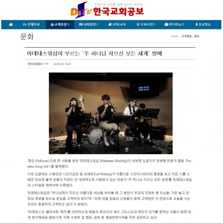 [기사] 마데테스워십이 부르는 '주 하나님 지으신 모든 세계' 발매(한국교회공보)