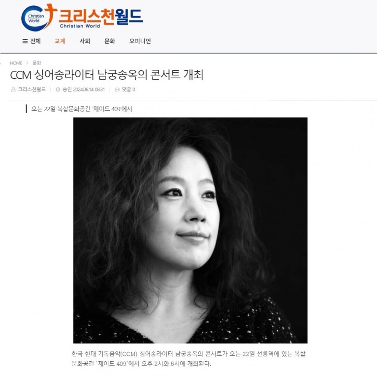 뮤직타임 [기사] CCM 싱어송라이터 남궁송옥의 콘서트 개최(크리스천월드)