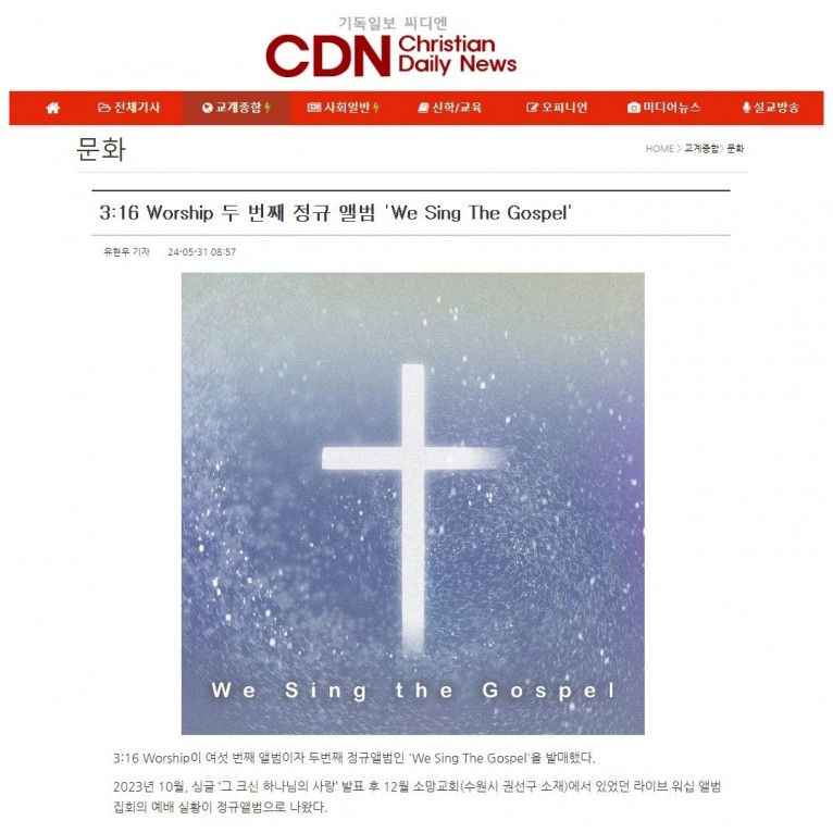 뮤직타임 [기사] 3:16 Worship 두 번째 정규 앨범 'We Sing The Gospel'(기독일보 씨디엔)