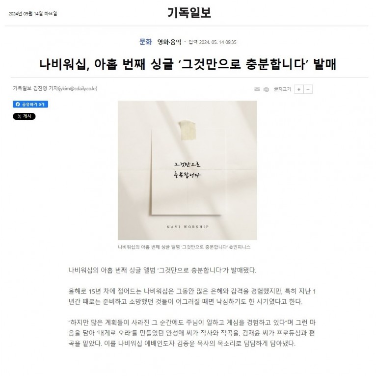 [기사] 나비워십, 아홉 번째 싱글 ‘그것만으로 충분합니다’ 발매(기독일보)