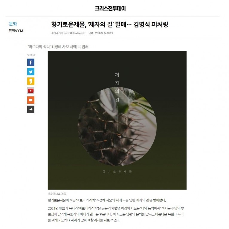 뮤직타임 [기사] 향기로운제물, ‘제자의 길’ 발매… 김명식 피처링(크리스천투데이)