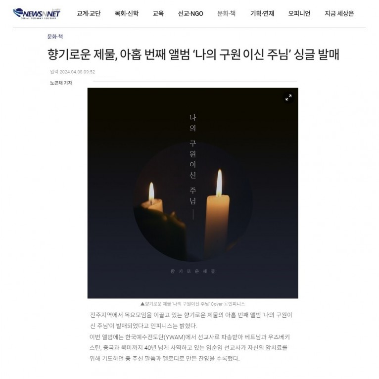 [기사] 향기로운 제물, 아홉 번째 앨범 ‘나의 구원이신 주님’ 싱글 발매(뉴스앤넷)